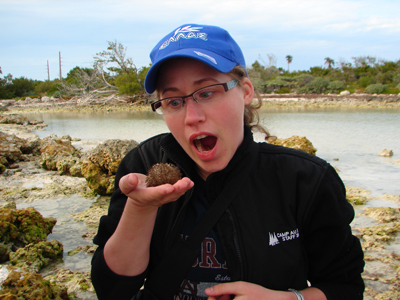 A student holds a conch shell with body extended at Bahia Honda State Park, Florida Keys.
