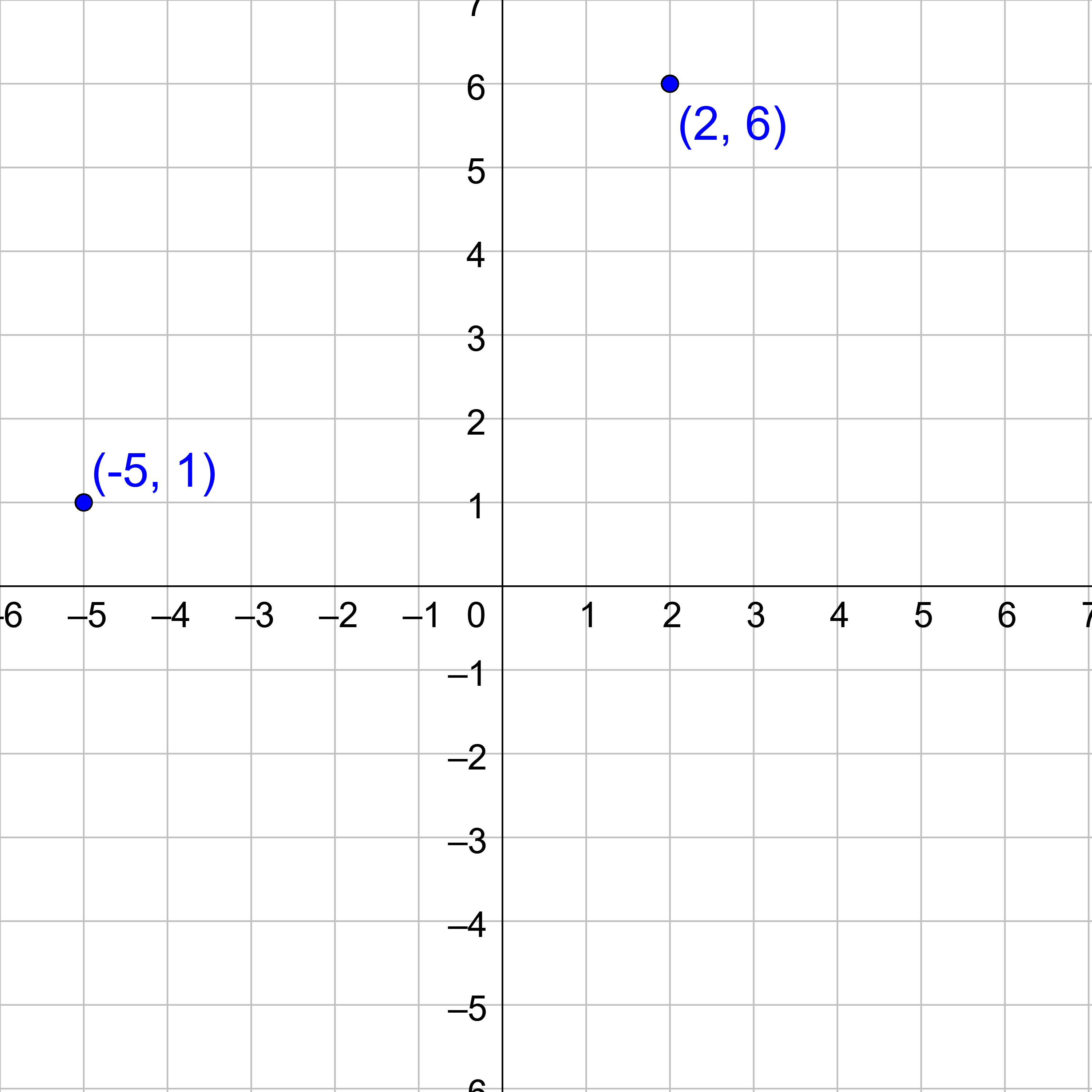 - Plot the points (−5, 1) and (2, 6). Find the coordinates of the midpoint of the line segment joining the points and the distance between the points.