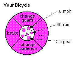The software bicycle would also have methods that allowed you to brake, change the pedal cadence and change gears. (The bike would not have a method for changing the speed of the bicycle as the bike's speed is really just a side-effect of what gear you're in, how fast you're pedaling and how steep the hill is.)