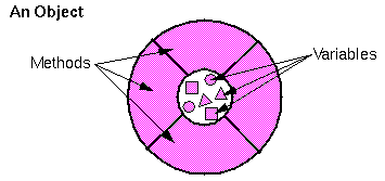 As you can see from the diagrams, the object's variables make up the center or nucleus of the object and the methods surround and hide the object's nucleus from other objects in the program. Packaging an object's variables within the protective custody of its methods is called encapsulation. Typically, encapsulation is used to hide unimportant implementation details from other objects. When you want to change gears on your bicycle, you don't need to know how the gear mechanism works, you just need to know which lever to move. Thus, the implementation can change at any time without changing other parts of the program.