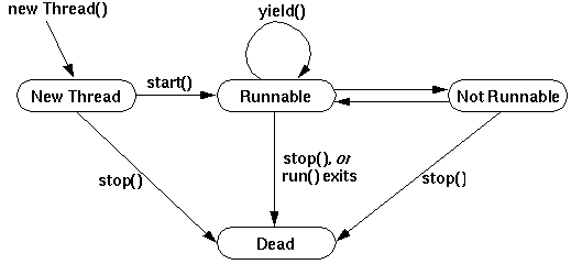 The following diagram illustrates the various states that a Java thread can be in at any point during its life and which method calls cause a transition to another state. This diagram is not a complete finite state diagram, but rather an overview of the more interesting and common facets of a thread's life. The remainder of this page discusses a Thread's life cycle in terms of its state.