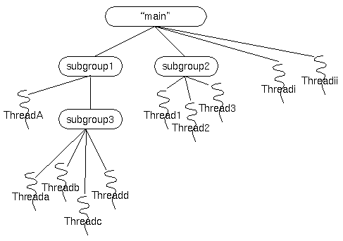 The ThreadGroup class manages groups of threads for Java applications. A ThreadGroup can contain any number of threads, presumably related in some way such as who created them, what function they perform, or when they should be started and stopped.ThreadGroups can contain not only threads but also other ThreadGroups. The top-most thread group in a Java application is the thread group named "main". You can create threads and thread groups in the "main" group. You can also create threads and thread groups in subgroups of "main" and so on. The result is a root-like hierarchy of threads and thread groups.