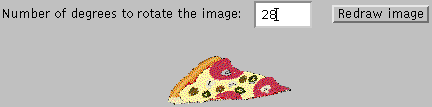 public class ImageRotator extends Applet { . . . RotatorCanvas rotator; double radiansPerDegree = Math.PI / 180; public void init() { //Load the image. Image image = getImage(getCodeBase(), "../images/pizza.gif"); ...//Create the component that uses the image filter: rotator = new RotatorCanvas(image); . . . add(rotator); . . . } public boolean action(Event evt, Object arg) { int degrees; ...//Get the number of degrees to rotate the image by. //Convert to radians. rotator.rotateImage((double)degrees * radiansPerDegree); return true; } } class RotatorCanvas extends Canvas { Image sourceImage; Image resultImage; public RotatorCanvas(Image image) { sourceImage = image; resultImage = sourceImage; } public void rotateImage(double angle) { ImageFilter filter = new RotateFilter(angle); ImageProducer producer = new FilteredImageSource( sourceImage.getSource(), filter); resultImage = createImage(producer); repaint(); } public void paint(Graphics g) { Dimension d = size(); int x = (d.width - resultImage.getWidth(this)) / 2; int y = (d.height - resultImage.getHeight(this)) / 2; g.drawImage(resultImage, x, y, this); } }How the Code Works