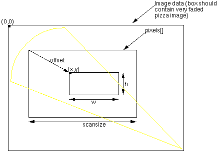setPixels()methods. These methods determine exactly what image data is used to construct the Image. One or both of thesetPixels()methods may be called multiple times during the construction of a single image. Each call gives the ImageConsumer information about a rectangle of pixels within the image. When the ImageConsumer receives animageComplete()message, then it can assume that it will receive no furthersetPixels()calls, and that the image data is complete.The following illustration and table describe the arguments to the