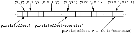 w*hentries, depending on the values ofoffsetandscansize. Here's the formula for determining what entry in thepixelsarray contains the data for the pixel at (m,n).The above formula assumes that (m,n) is in the rectangle thisoffset + (m - x) + (n - y) * scansize [CHECK!]setPixels()call specifies, and that (m,n) is relative to the image origin. Below is an illustration of thepixelsarray that might make this clearer. It shows how a specific pixel (for example, (x,y)) maps to an entry in thepixelsarray.