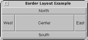 As the above applet shows, a BorderLayout has five areas: north, south, east, west, and center. If you enlarge the window, you'll see that the center area gets as much of the newly available space as possible. The other areas expand only as much as necessary to keep all available space filled.