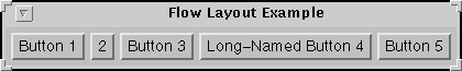 The FlowLayout class has three constructors:setLayout(new FlowLayout()); setFont(new Font("Helvetica", Font.PLAIN, 14)); add(new Button("Button 1")); add(new Button("2")); add(new Button("Button 3")); add(new Button("Long-Named Button 4")); add(new Button("Button 5"));Thepublic FlowLayout() public FlowLayout(int alignment) public FlowLayout(int alignment, int horizontalGap, int verticalGap)alignmentargument must have the valueFlowLayout.LEFT,FlowLayout.CENTER, orFlowLayout.RIGHT. ThehorizontalGapandverticalGaparguments specify the number of pixels to put between components. If you don't specify a gap value, FlowLayout acts as if you specified5for the gap value.