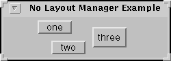 paint()method implementation of the window class. (Here's a link to the whole program. The program runs either within an applet, with the help of AppletButton, or as an application.)//Where instance variables are declared: private boolean laidOut = false; private Button b1, b2, b3; public NoneWindow() { super(); setLayout(null); setFont(new Font("Helvetica", Font.PLAIN, 14)); b1 = new Button("one"); add(b1); b2 = new Button("two"); add(b2); b3 = new Button("three"); add(b3); } public void paint(Graphics g) { if (!laidOut) { Insets insets = insets(); //We're guaranteed that insets() will return a valid Insets //if called from paint() -- it isn't valid when called from //the constructor. insets = insets(); // We could perhaps cache this in an ivar, but // insets can change, and when they // do, the AWT creates a whole new Insets // object; the old one is invalid. // BUT WILL IT REALLY CHANGE??? b1.reshape(50 + insets.left, 5 + insets.top, 50, 20); b2.reshape(70 + insets.left, 35 + insets.top, 50, 20); b3.reshape(130 + insets.left, 15 + insets.top, 50, 30); laidOut = true; } }