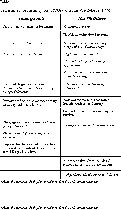 Both Turning Points (1989) and This We Believe (1995) address the structures found in exemplary middle schools and emphasize the need for teachers specifically trained for and committed to teaching middle schoolers. These documents also address characteristics and practices of effective middle school teachers. I was intrigued when I placed the ideas in these documents side by side and identified the items individual teachers are free to implement regardless of the structures and programs determined by administrators in their schools. Table 1 illustrates this. The items in italics are ones which can be implemented by individual teachers in their classrooms.