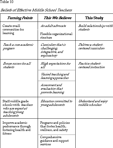 The middle school movement could benefit from additional studies concerning common characteristics of effective middle school teachers (NMSA, 1997) and other intangible issues connected to effective middle school teachers (Strahan, 1992). My study was limited to four teachers in the Michiana area and may or may not be typical of other effective middle school teachers.