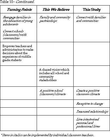 As I expected, the curriculum and instruction used by the teachers in my study is student- rather than curriculum-centered. What I find surprising and reassuring, however, is how well each of the teachers classroom practices fit into the theoretical framework drawn from Turning Points and This We Believe. Displaying evidence of how well these four teachers matched the ideal qualities was relatively easy though I specifically chose not to revisit the theoretical framework during data collection and analysis and while writing chapters 3-6.