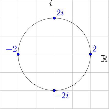 This gives all four solutions. Notice that if you graph these four solutions on a complex plane, they are evenly spaced around a circle with radius \(\sqrt[4]{16} = 2\).