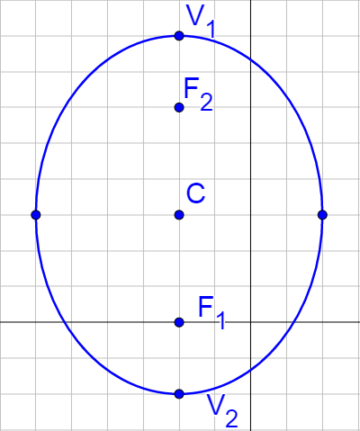 Graph the center and the foci. Notice that the major axis through the points is vertical, so this is a vertical ellipse.