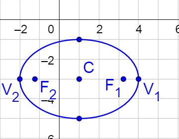 The larger number is under x, so this must be a horizontal ellipse. Compare the equation to the standard form, \(\frac{\left(x - h\right)^2}{a^2} + \frac{\left(y - k\right)^2}{b^2} = 1\), and see that h = 1, k = −3, a2 = 9 so a = 3, and b2 = 4 so b = 2.