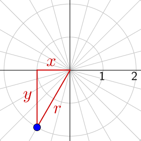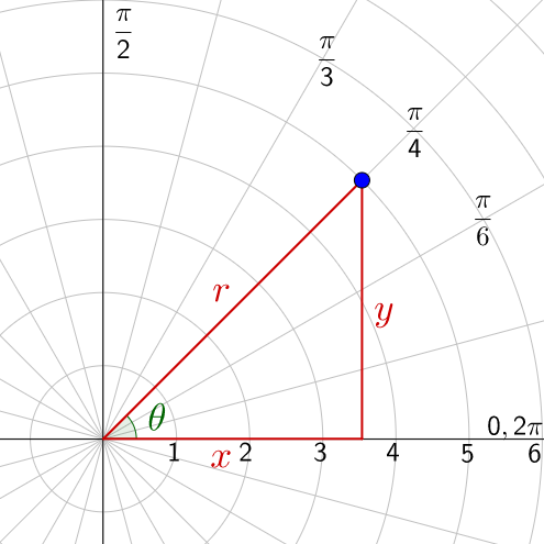 $$ \begin{align}x &= r \cos θ\\y &= r \sin θ\end{align} $$