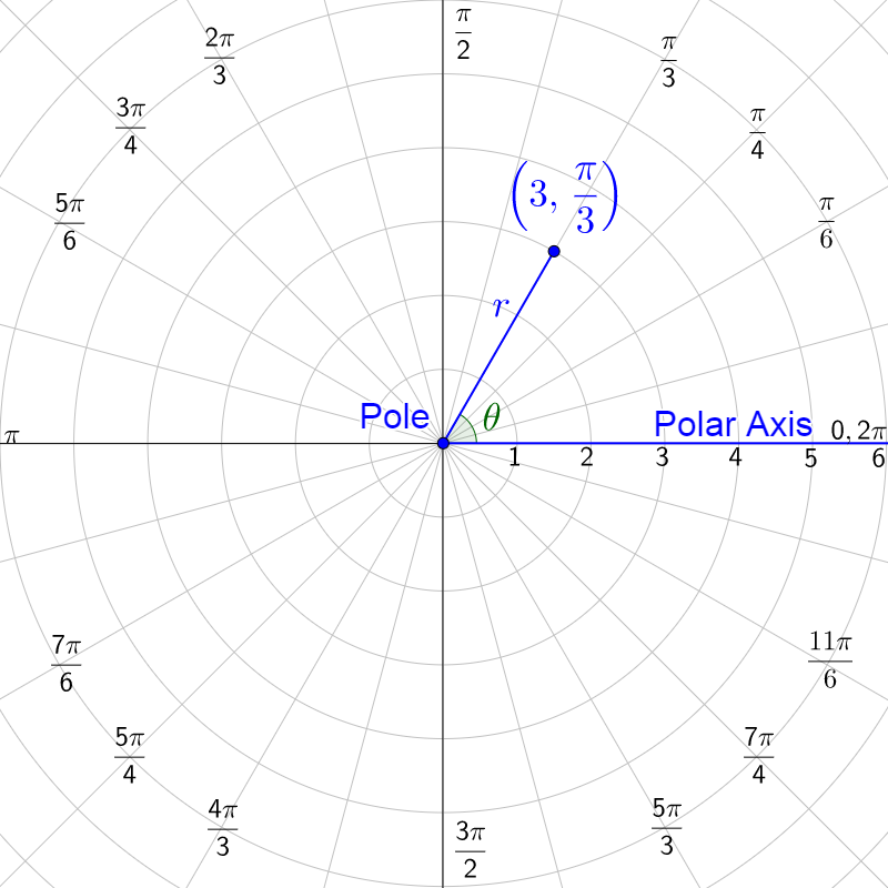 Polar coordinates give the location of a point as if it was on a circle as (r, θ). The angle variable, θ, tells the angle the a radius through the point is from the polar axis. The polar axis is the same as the positive x-axis in rectangular coordinates. The radius variable, r, tells how far along the radius the point is, or how far the point is from the origin or pole.