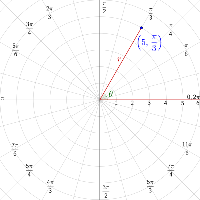 The angle is \(\frac{\pi}{3}\). Find that angle on the graph. The r is 5, so move 5 spaces out from the pole along the \(\frac{\pi}{3}\) line.