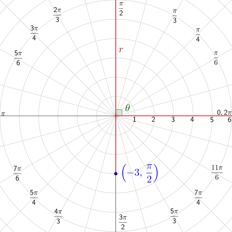 The angle is \(\frac{\pi}{2}\). Find that angle on the graph. The r is −3, so move 3 spaces backwards from the pole along the \(\frac{\pi}{2}\) line.