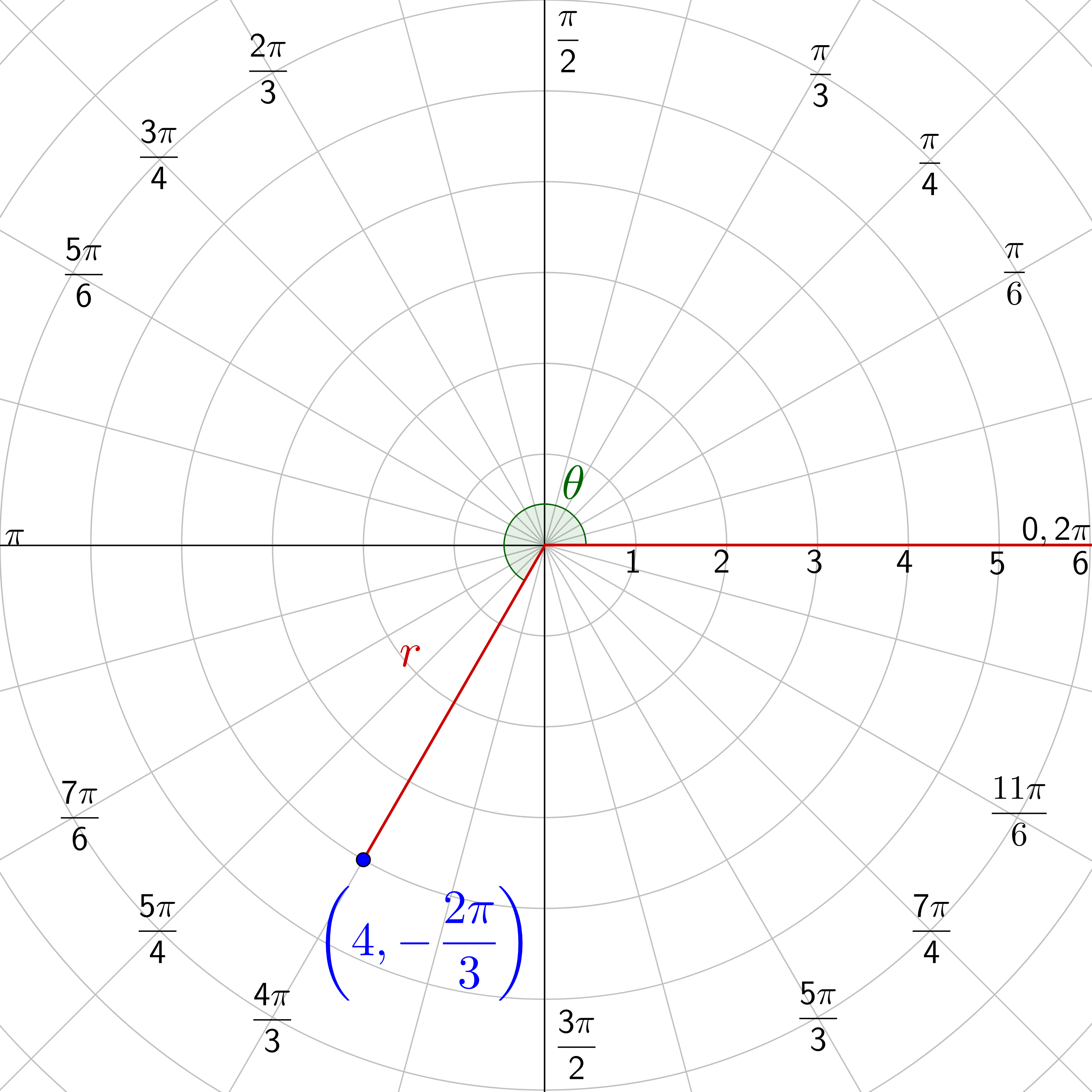 In the polar coordinate \(\left(2, \frac{4π}{3}\right)\), r = 2 and \(θ = \frac{4π}{3}\).