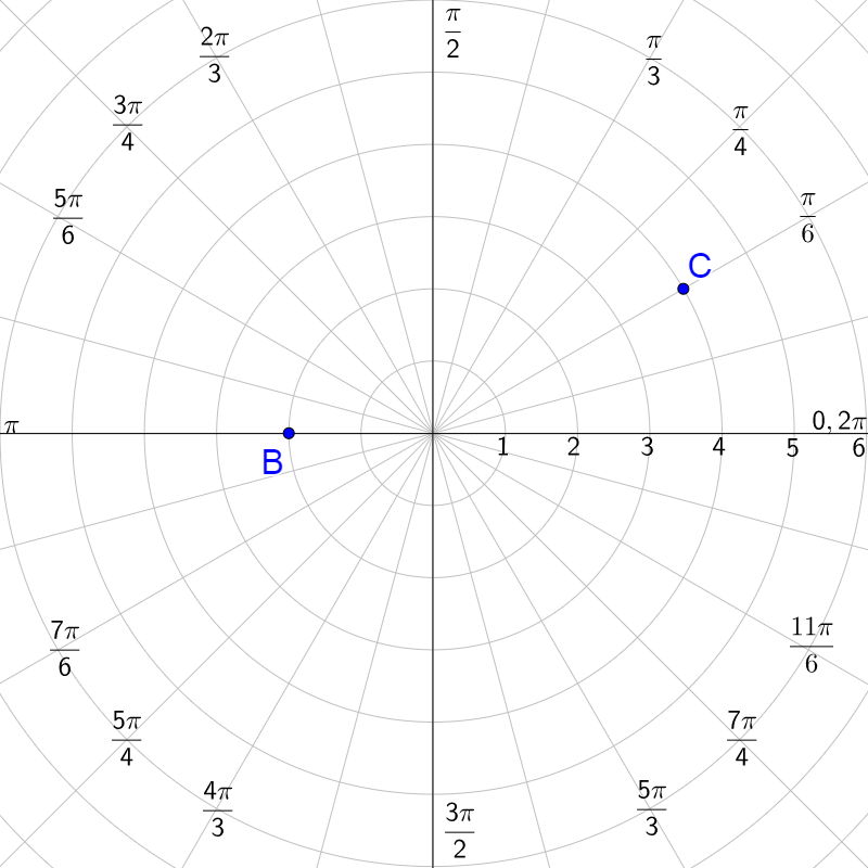 Graph B(2, π) and \(C\left(-4, \frac{7π}{6}\right)\).