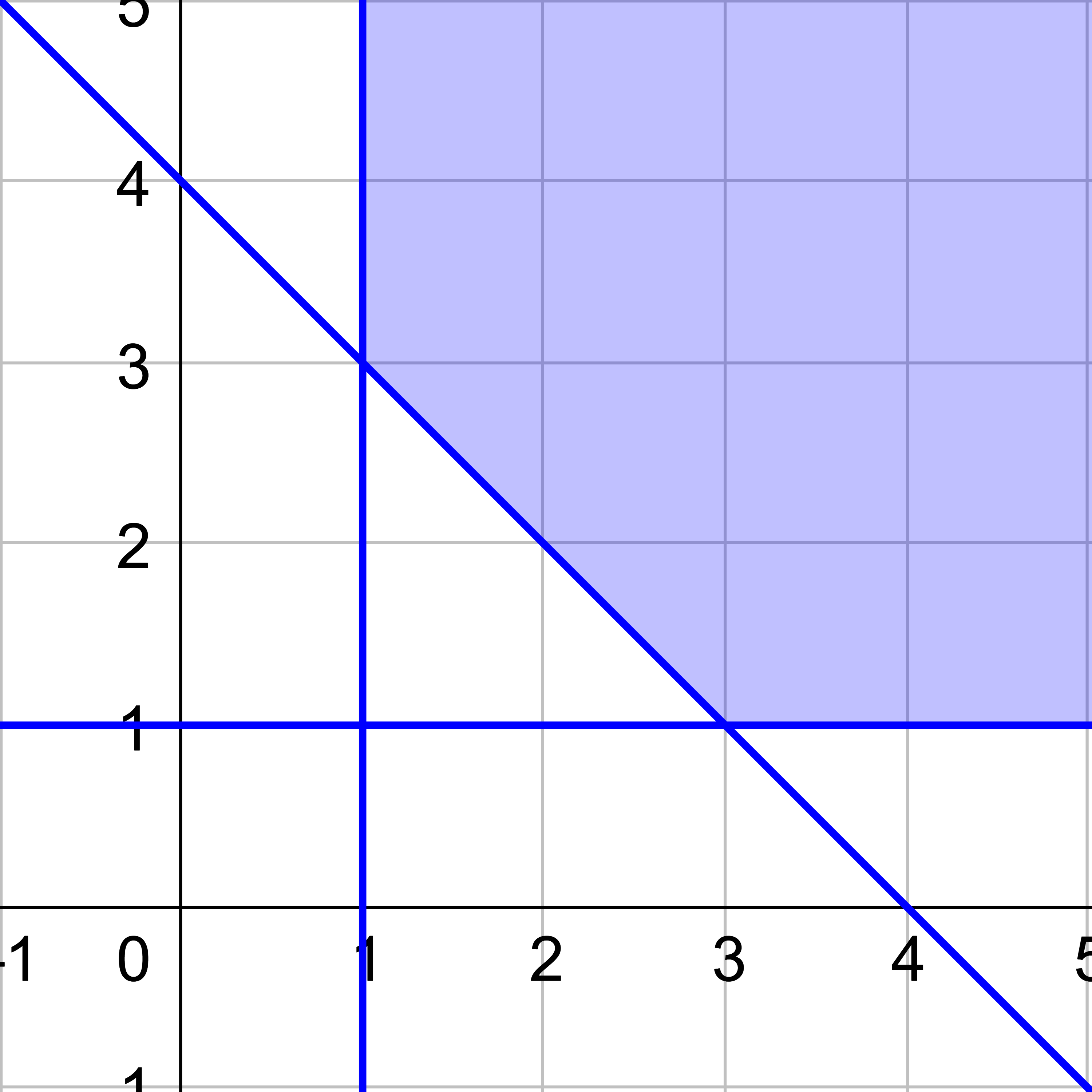 $$ \left\{\begin{align} y &≥ 0 \\ x &≥ 1 \\ y &≥ -\frac{1}{2} x + 3 \end{align}\right. $$