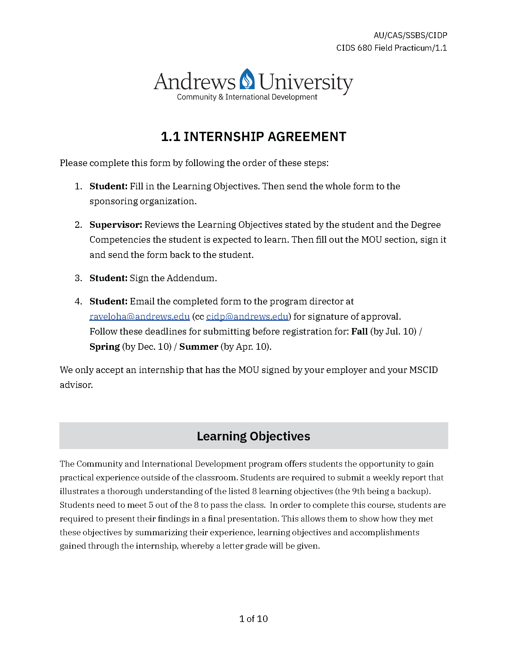 This document contains a Learning Objectives, Memorandum of Understanding, and Addendum section. It outlines the objectives and expectations for the internship, an official agreement between the Community & International Development Program and the agency/organization in which the student will complete internship requirements, and a commitment to responsibilities by the student. Must be submitted to CIDP before registering in CIDS 680.