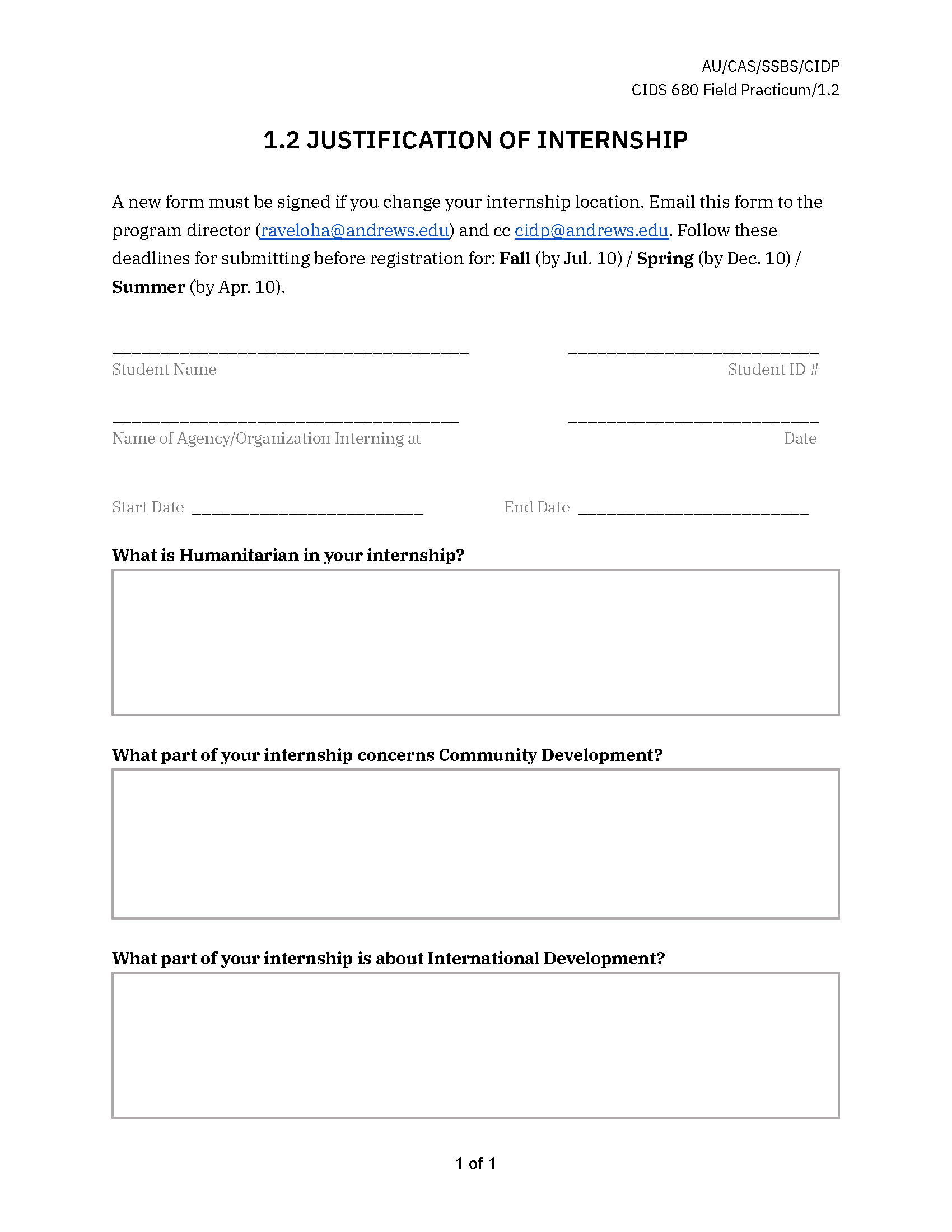 This form describes how your internship is related to the humanitarian and development field. Must be submitted to CIDP before registering in CIDS 680.