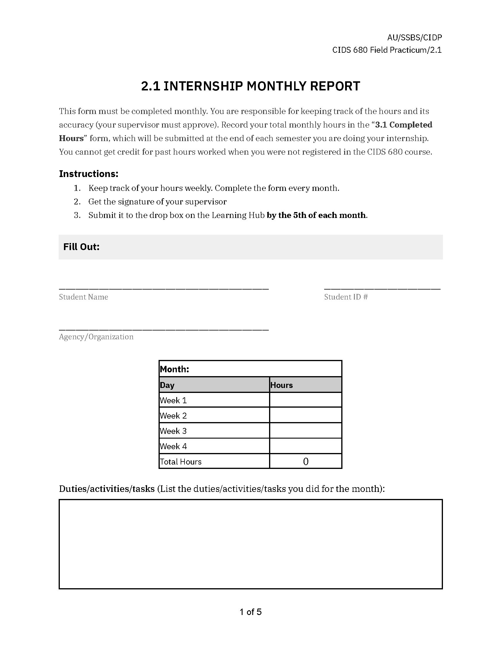 Monthly turn in the "2.1 Internship Monthly Report". Student reports on hours interned and reports on Learning Objectives met that month. Cannot get credit for past hours worked when not registered in CIDS 680 course. Keep track of total hours using the "3.1 Completed Hours" form, and submit at the end of each semester inter.