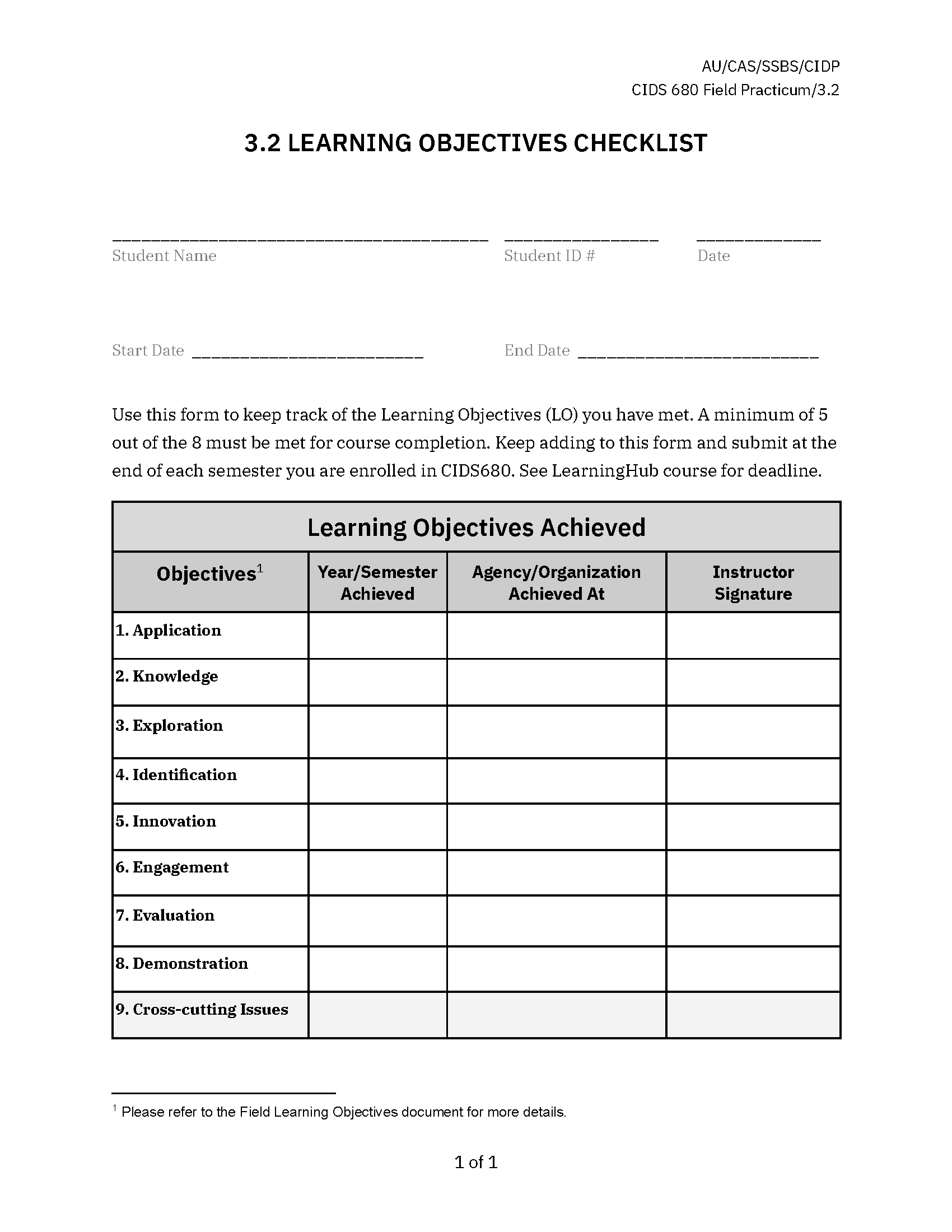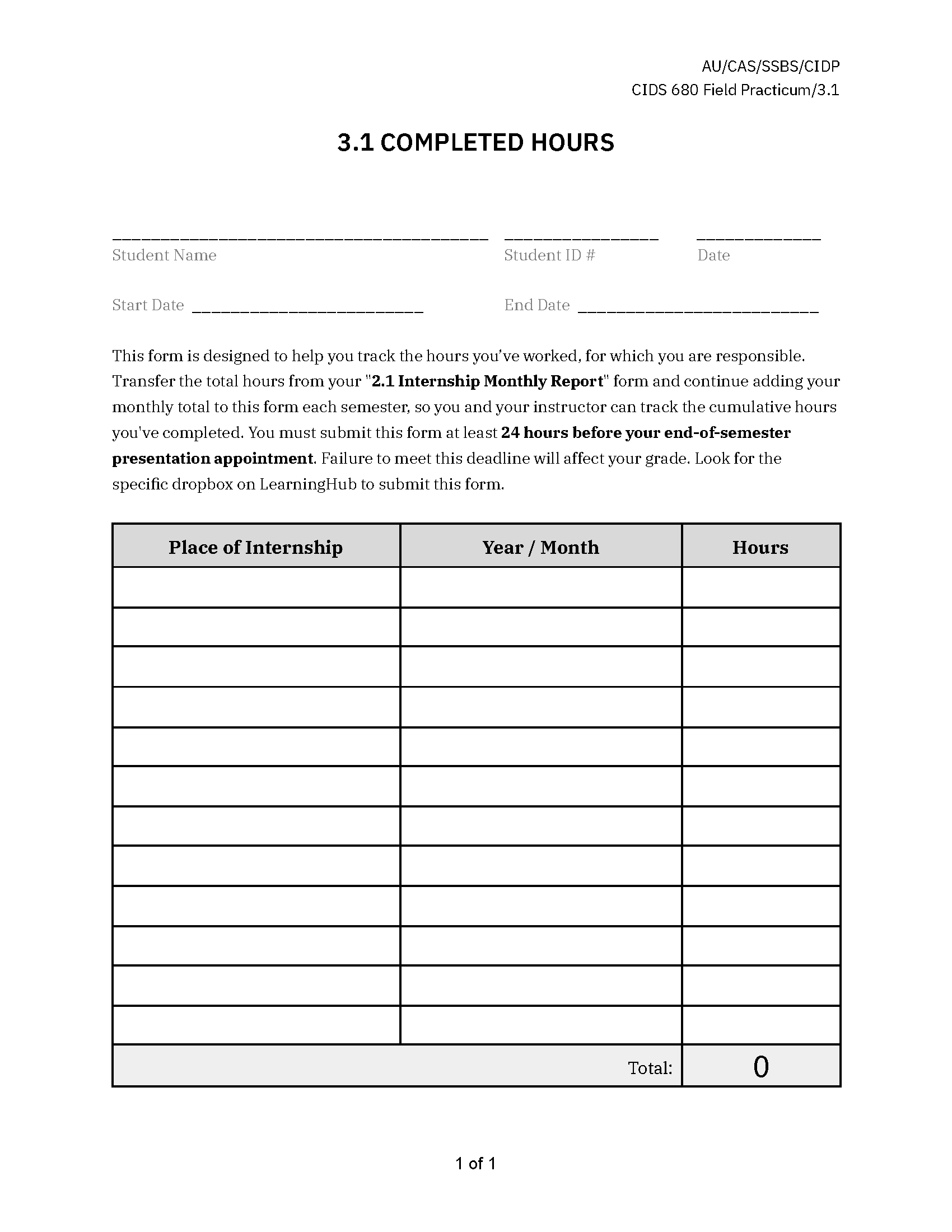 NOTE: Full instructions for this course are found on the LearningHub for those who have registered in the CIDS680 Field Practicum course. You must turn in your forms on the LearningHub.