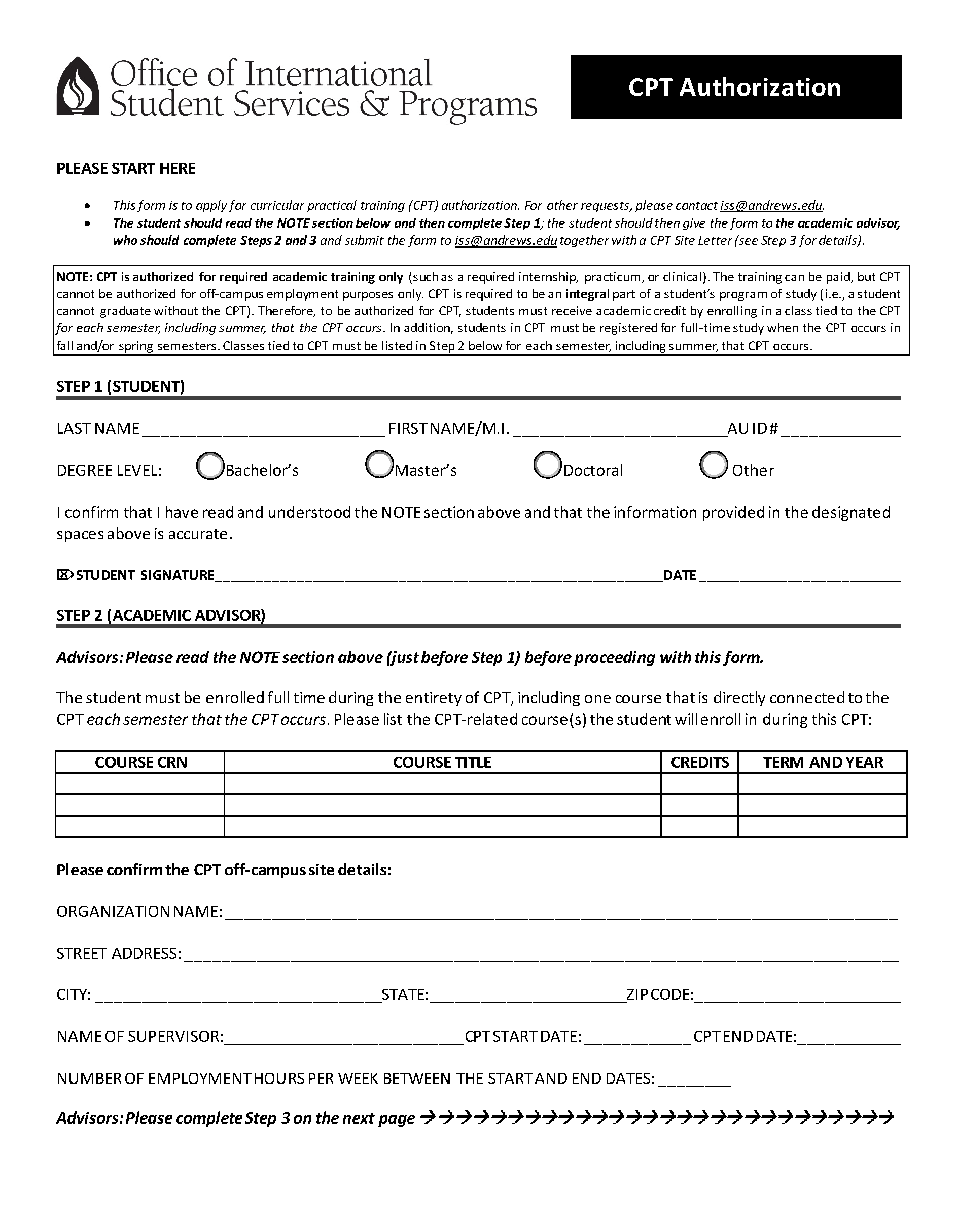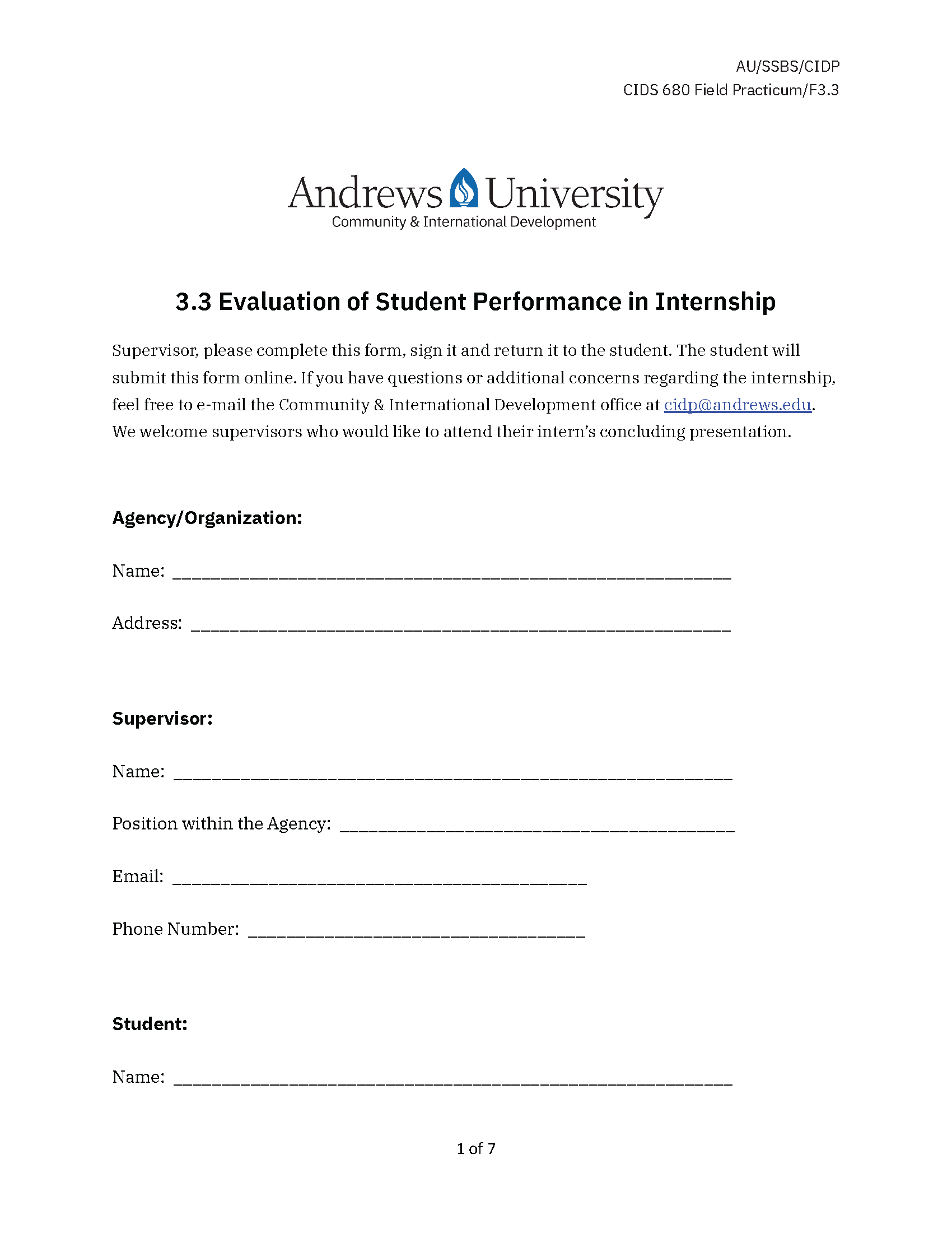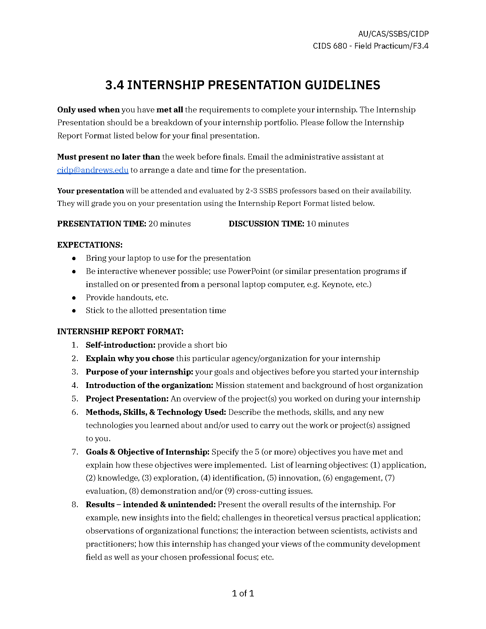 This document and process is requred by International Student Services who will do a paid internship. International students must not start their off-campus paid internship until this document is approved. Must be submitted to CIDP before registering in CIDS 680.