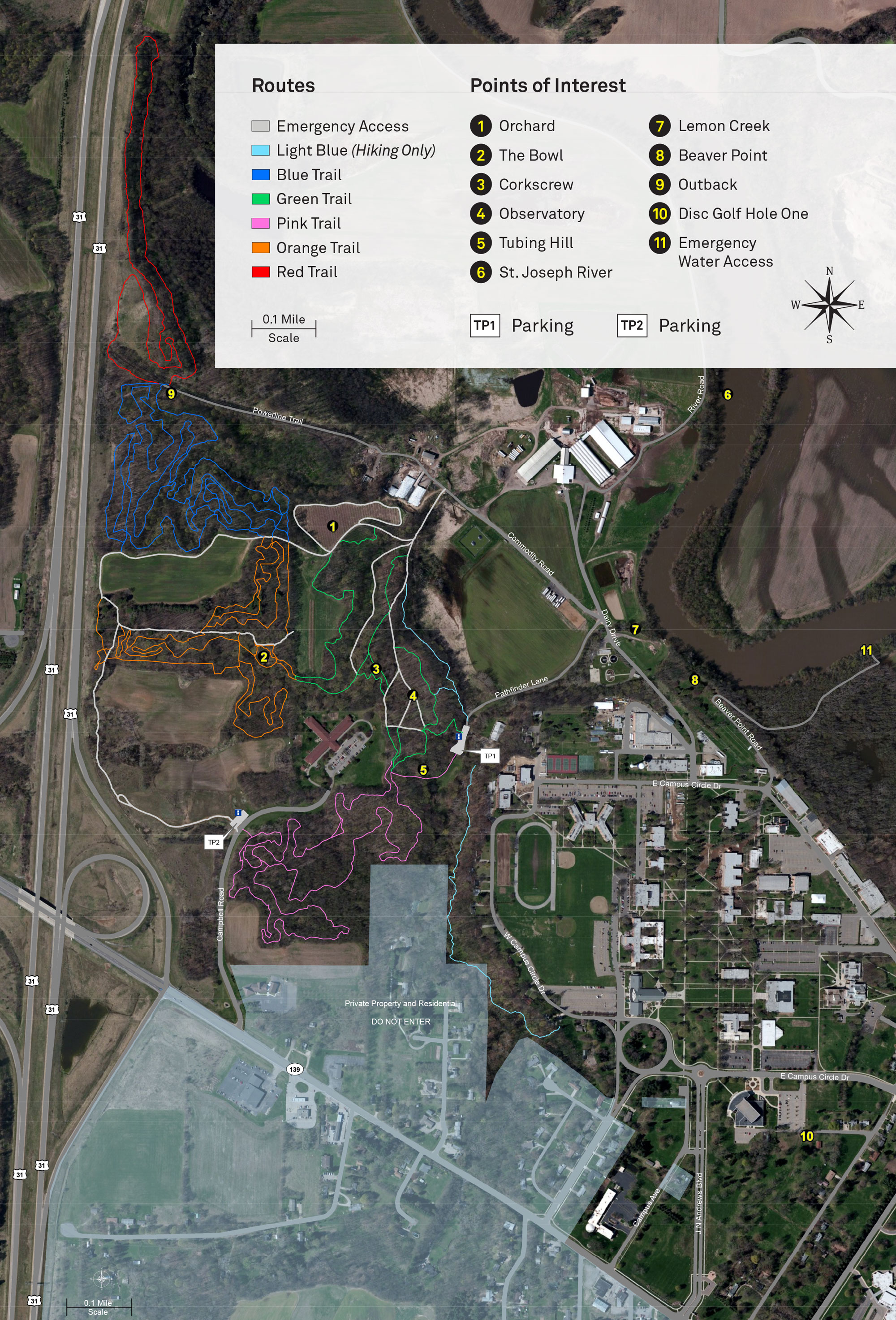 Transportation and Campus Safety will be working over the summer to install a permanent parking lot in place of the dirt parking area along the entrance to Timber Ridge Manor. The development of trail signage is underway, which will include a map kiosk at the entrance and trail markers. There will also be points of interest markers for places such as the Andrews Observatory, the Bowl and the Corkscrew.