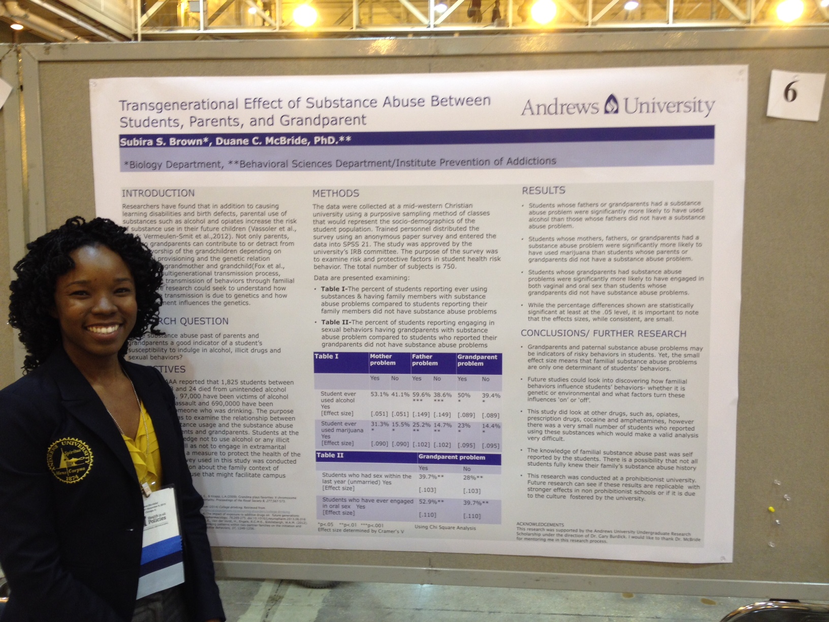 Subira Brown, an Undergraduate Research Scholar and J.N. Andrews Scholar, presented her poster on the "Transgenerational Effect of Substance Abuse Between Students, Parents, and Grandparents" at the annual meeting of the American Public Health Association.