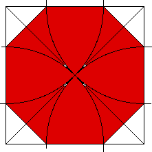 The construction of the octagon is a little trickier. Construct a square. Locate the square's center using diagonals. Set the compass to the distance from a corner to the center. Draw arcs intersecting two sides from each corner. Connect these intersection points in sequence. Proof of this method and another method are given here. An alternate method, perhaps more straight-forward, is to circumscribe a square, bisects the sides, and connect the points of intersection between the square's vertices, the bisectors, and the circle.