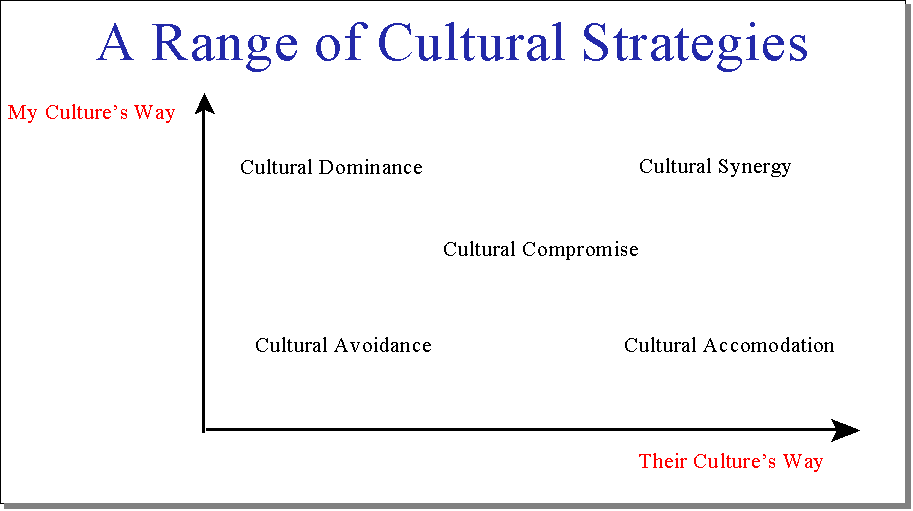 | Cultural Compromise | Occurs when policies and practices are broadly similar between two or more cultures involved. Works best and is often limited to those most similar to US (i.e. western Europe). May also involve concessions by both sides in order to work together. Powerful partner usually has to concede less. |